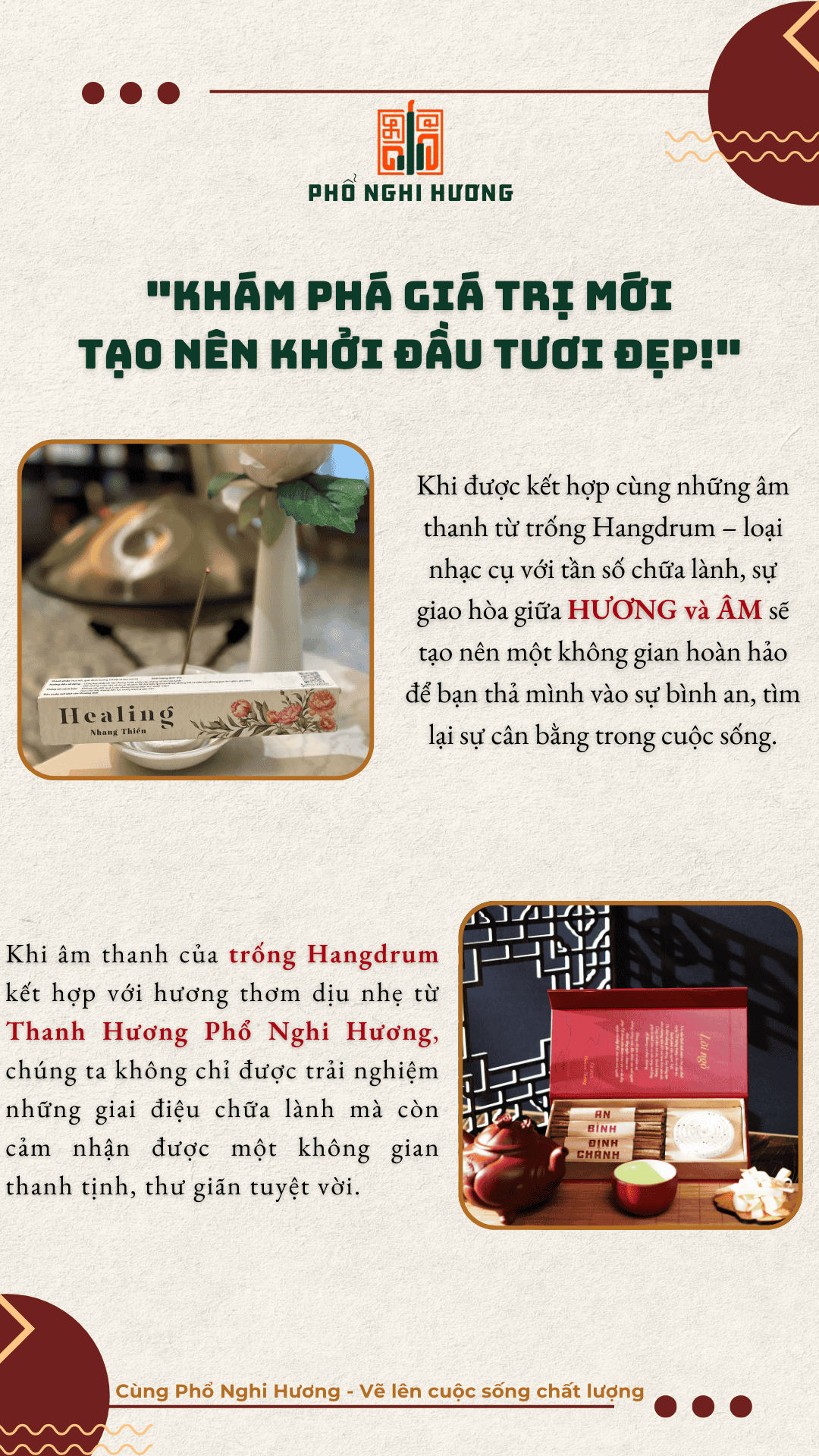 Khi âm thanh của trống Hangdrum kết hợp với hương thơm dịu nhẹ từ Thanh Hương Phổ Nghi Hương, chúng ta không chỉ được trải nghiệm những giai điệu chữa lành mà còn cảm nhận được một không gian thanh tịnh, thư giãn tuyệt vời.